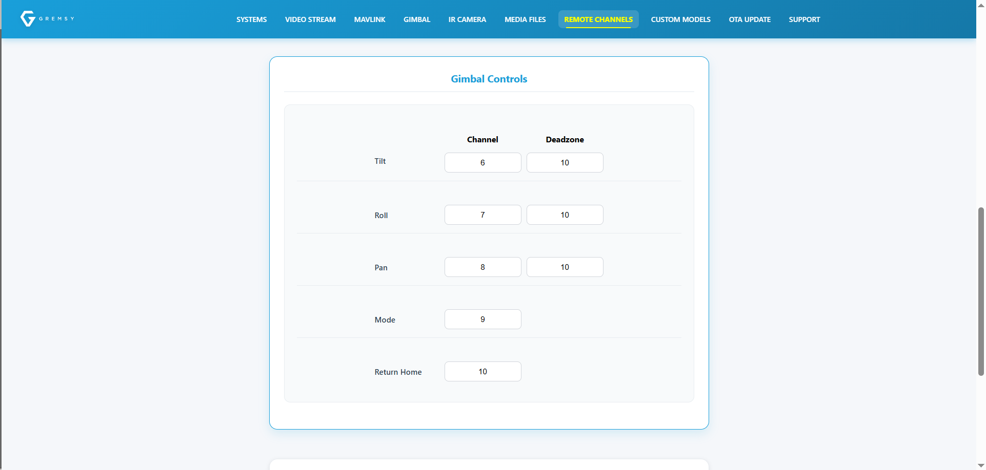 Configure the SBUS channels for each gimbal axis. Each axis supports a Deadzone setting to trim small control input variations. Maximum deadzone value: 100.