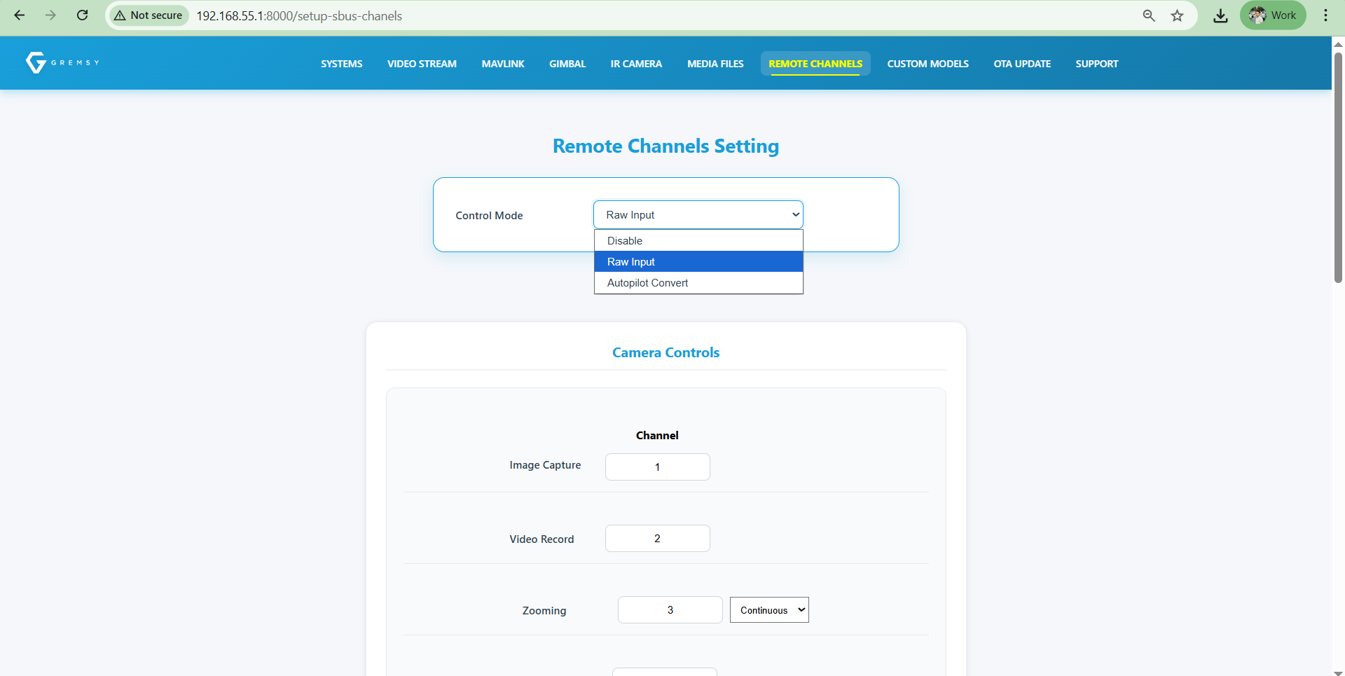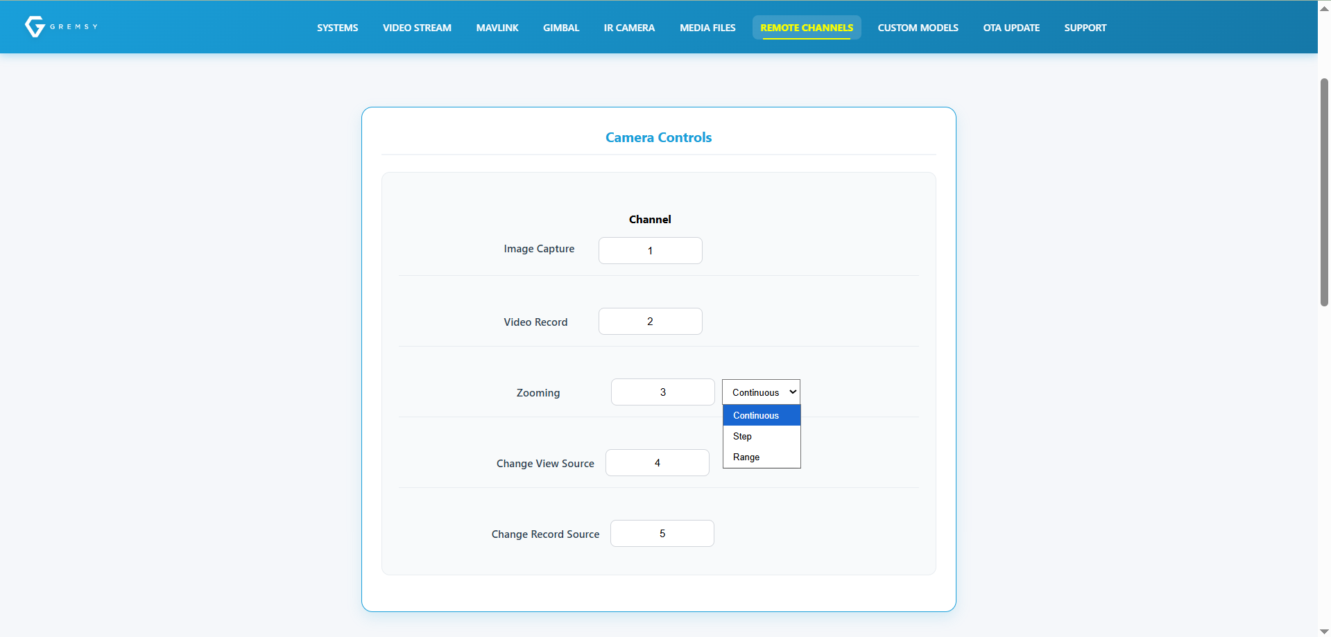 Configure the desired SBUS channels for camera control. Zoom supports three control types: Continuous, Step, and Range. Select the option that matches your control preference.