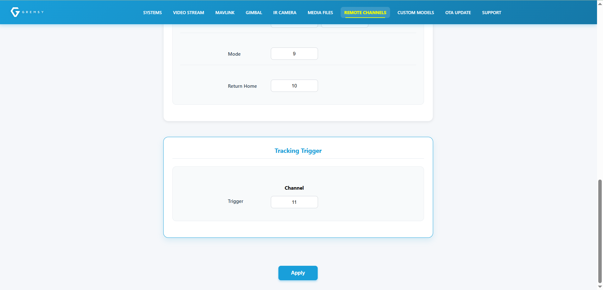 This article explains how to configure a Gremsy payload to receive direct SBUS commands from a remote controller. SBUS Raw Input can be used for basic camera functions such as capture/trigger, zoom, video source switching, tracking trigger, and gimbal movement.