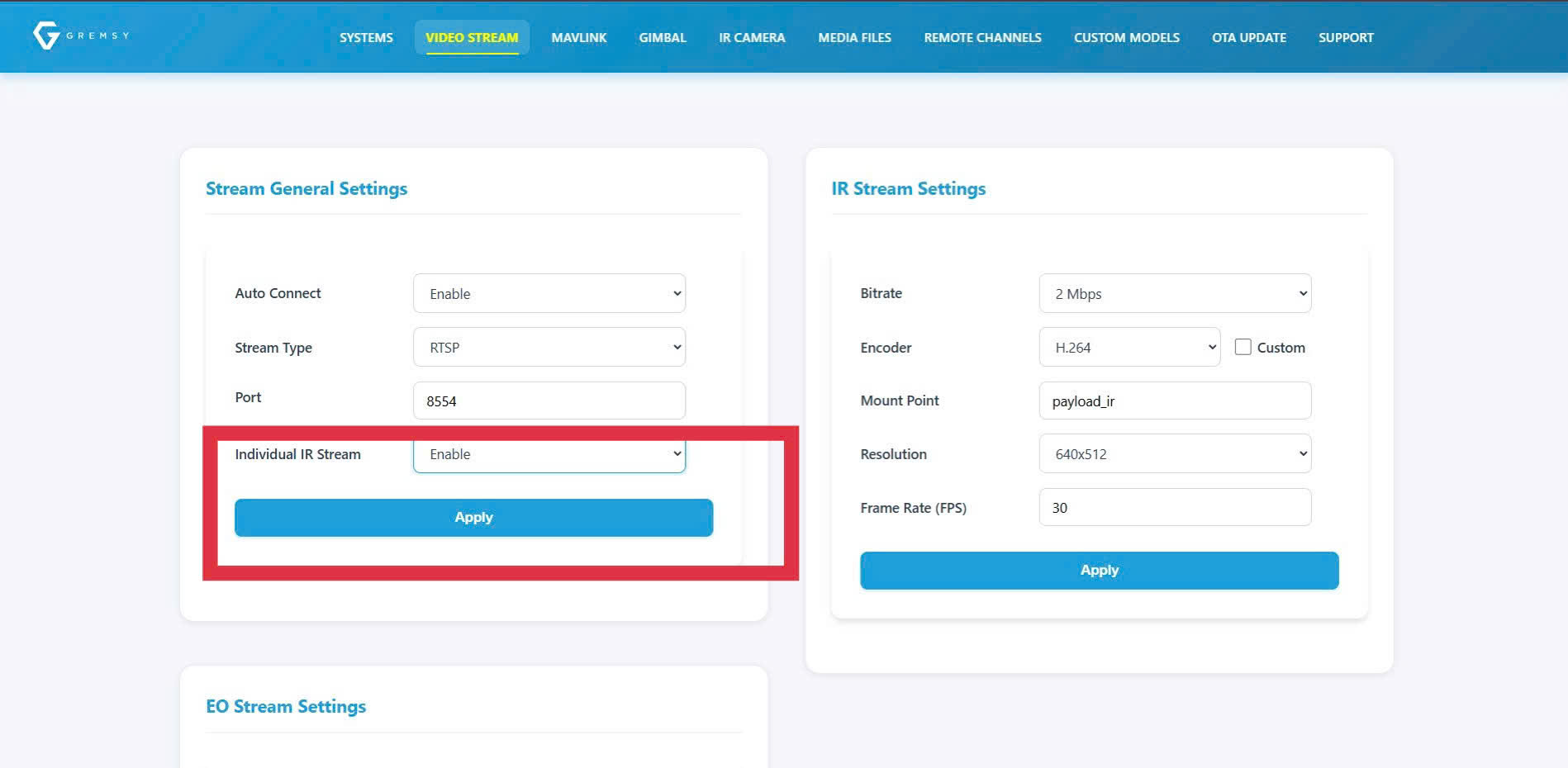 - Enable – Streams IR video separately from EO